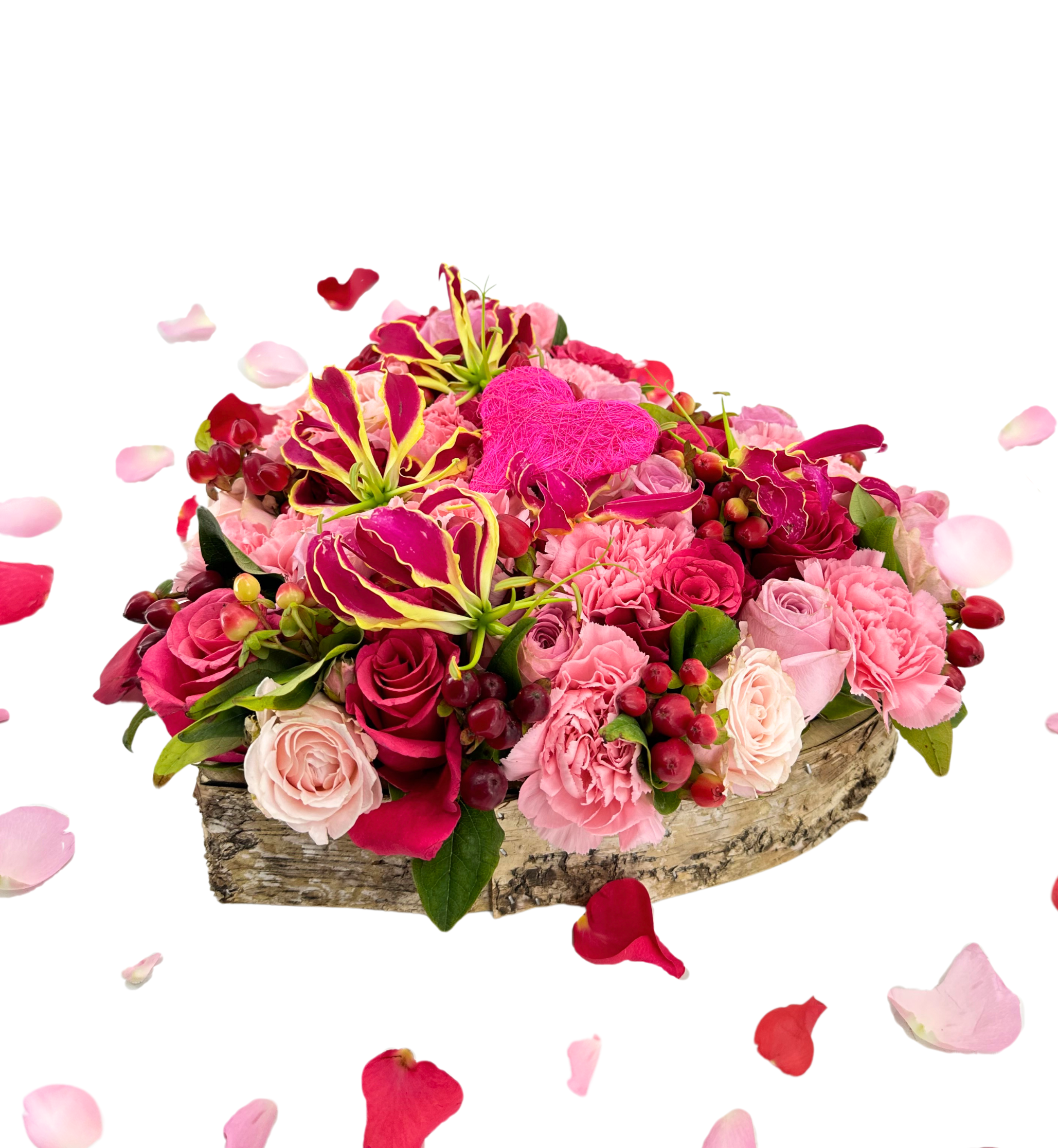 Een romantische bloementaart in een hartvorm van berkenschors. Bloementaarten worden opgestoken op steekschuim en zijn erg populair om cadeau te geven (Valentijn tip!)