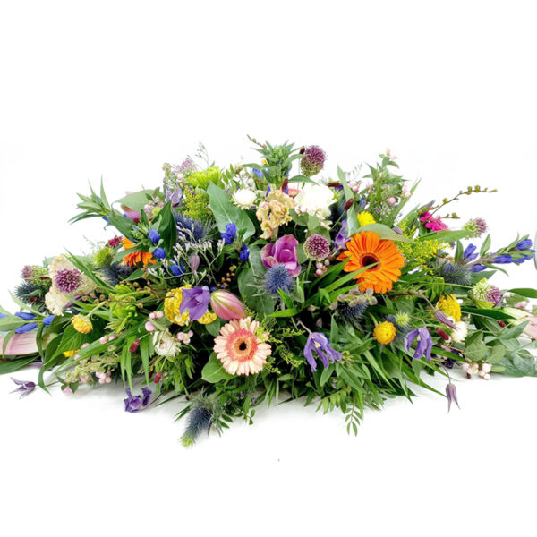 Een groot ovaal vormig rouwarrangement met veel kleur en veel verschillende bloemen, zoals gerbera’s, rozen, lelies, solidago en andere seizoensbloemen. Heeft u voorkeur voor een aangepaste kleurstelling, dan kunt u dit in de opmerkingen kenbaar maken.