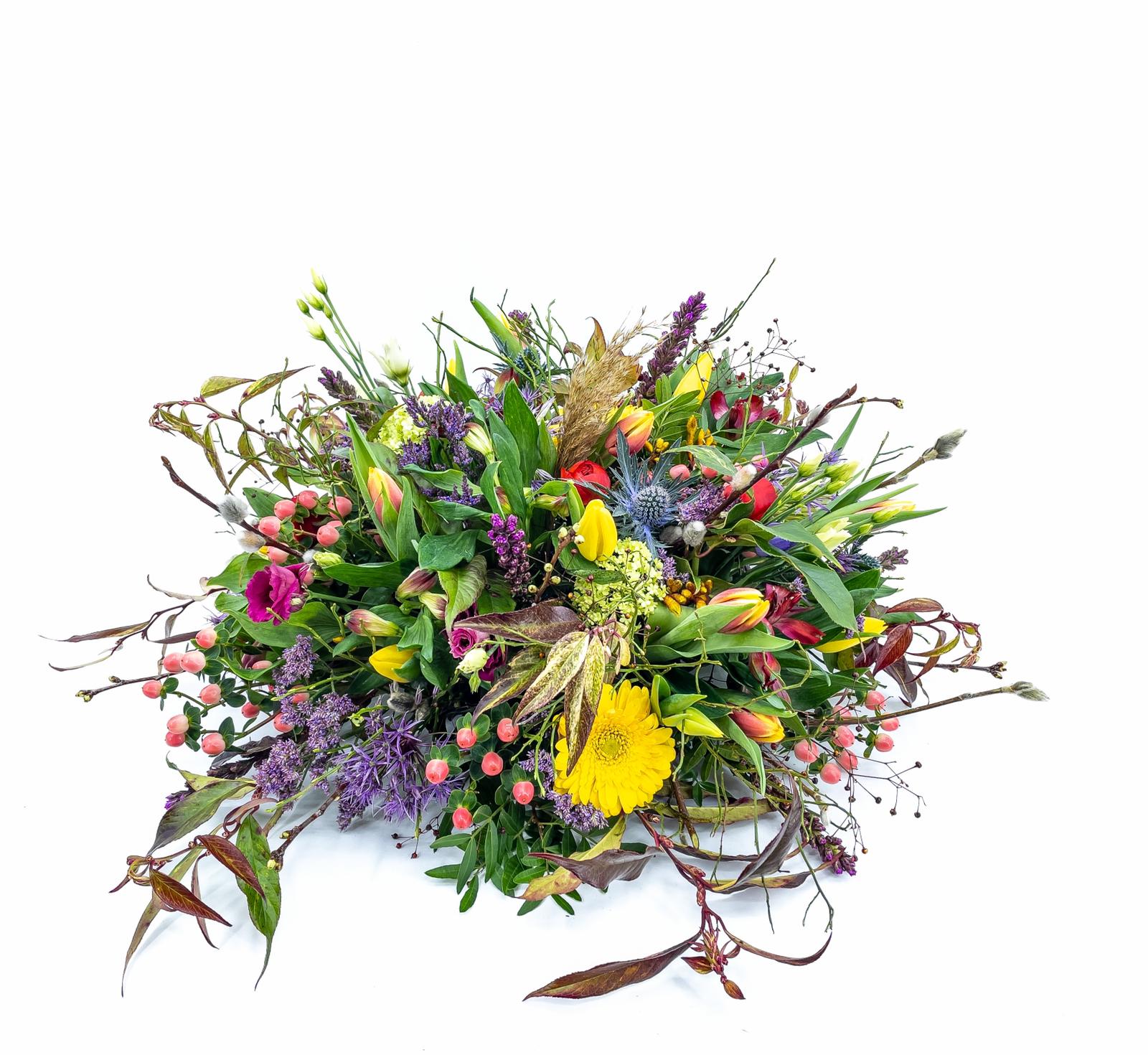Een klein, kleurrijk en wild afscheidsarrangement, met o.a. tulpen (seizoensafhankelijk), gerbera’s, alliums, lisianthus, takken en divers groen. Heeft u voorkeur voor een aangepaste kleurstelling, dan kunt u dit in de opmerkingen kenbaar maken.
