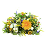 Een geel/wit gekleurd afscheidsbloemstuk, met rode en paarse accenten. Goed gevuld, met o.a. zonnebloemen, gele gerbera’s, witte lisianthus, paarse veronica en diverse soorten groen.