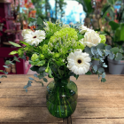 Dit elegant witte boeket is samengesteld met o.a. gerbera’s, rozen, alstroemeria’s en groen. Dit boeket past mooi bij onze Flora, Plukker en Felicia vazen.